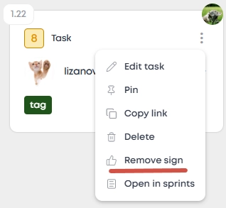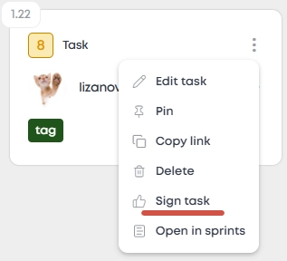 Access: Only a board member who has access to this function in the project can sign a task. Access is configured by the project's author or editor.
